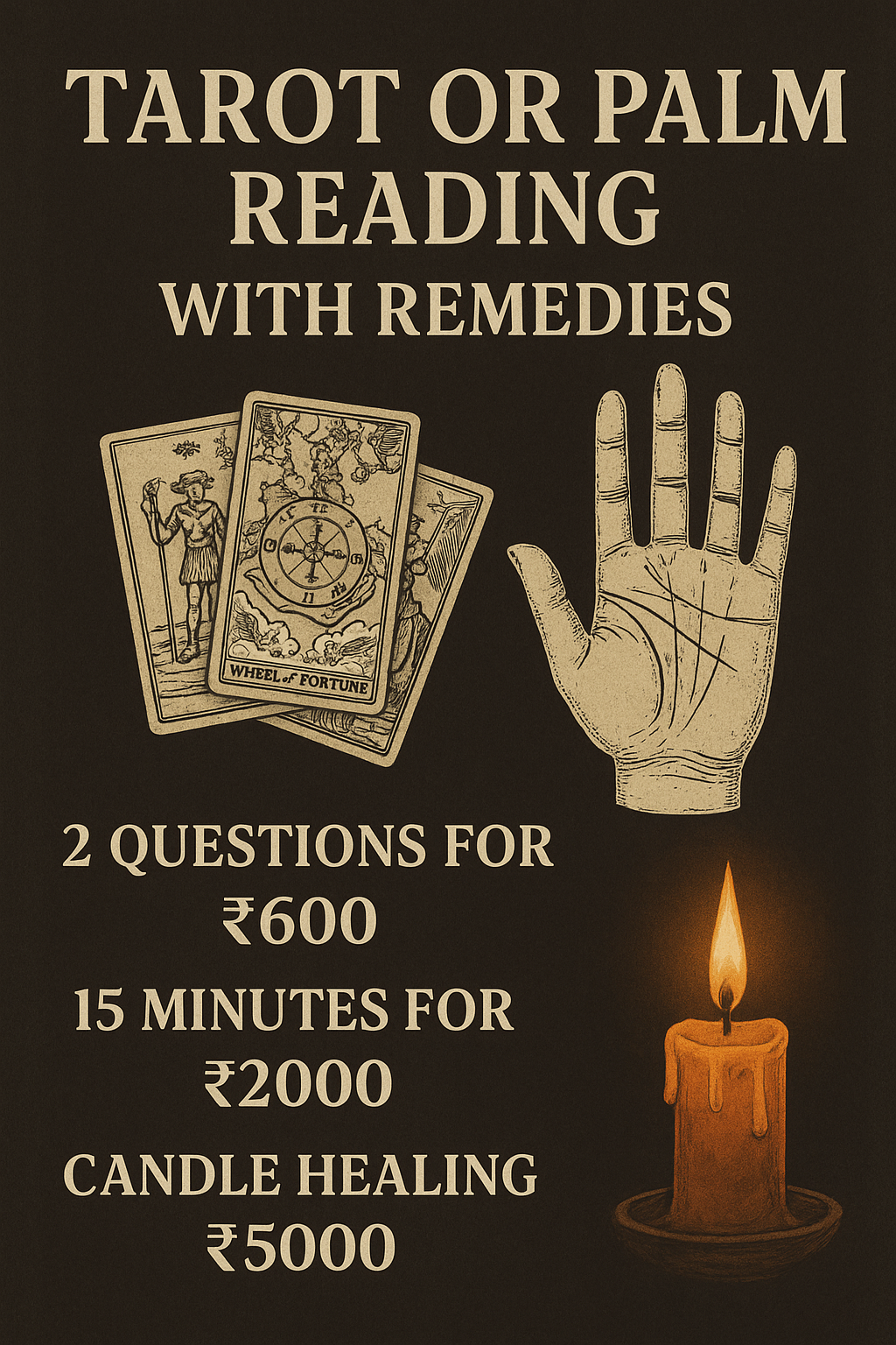 Our Tarot and Palm Reading sessions offer clear, intuitive guidance to help you understand your present energies, life patterns, and future possibilities. Tarot reveals messages around love, career, relationships, and personal growth, while Palm Reading decodes the lines of your hand to uncover destiny, strengths, challenges, and soul purpose. Each session is confidential, compassionate, and deeply insightful—designed to bring clarity, confidence, and direction when you need it most. ✨